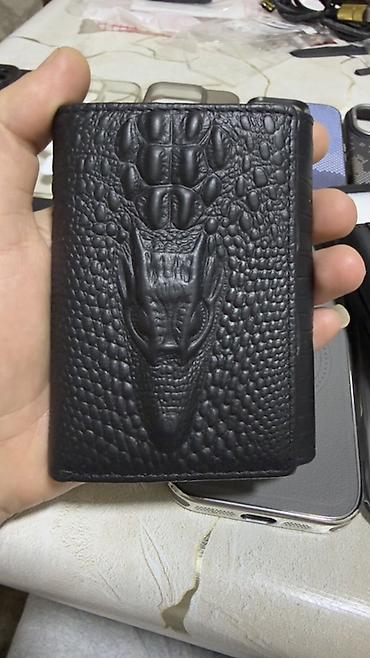 Qara rəngdə, timsah naxışlı, qatlanan kart-cüzdan. Ön tərəfində relyefli timsah başı dizaynı var. İç hissə çoxbölməlidir: