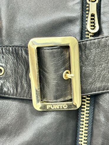 - Dizayn: asimmetrik ön fermuar, enli dəri kəmər (qızılı rəngdə metallı, PUNTO yazılı tokalı)