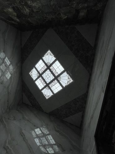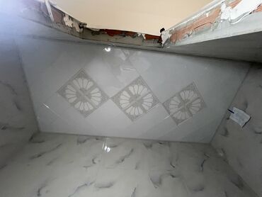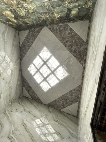- Mərkəzdə naxışlı kvadrat panellər, ətrafı tünd mermer effektli kəsimlə vurğulanmış kompozisiya
