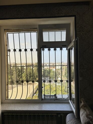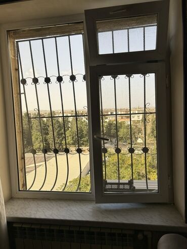 Pəncərə – plastik (PVC) çərçivəli, ikiqat şüşəli. - Ölçü: təxmini orta ölçülü, dördbucaqlı forma. - Konstruksiya: 3 bölməli – iki yan şaquli bölmə və aşağı hissədə kiçik ventilyasiya pəncərəsi ...