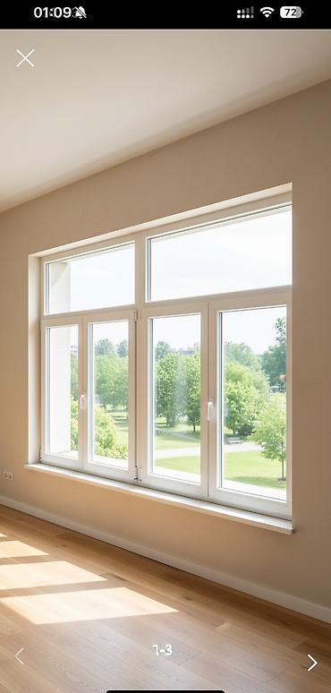 - Komplekt: müxtəlif ölçülərdə 2 əsas blok (üst transomlarla), açılan/çarxlı pəncərə qolları, şüşə paketlər və bir neçə ədəd ağ çərçivəli ağcaqanad toru