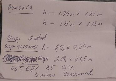 - Qapı: 2 ədəddir, üst hissədə transom şüşəli, orta hissəsi şüşəli, aşağı paneli kip, sağa açılan; PVC qulplu; qapaq-kasa komplekt.