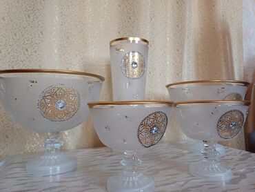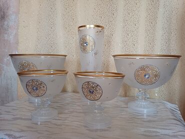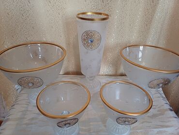 Şüşə ağır qablardır.2 ədəd meyvə qabı 1 ədəd şirniyyat qabı,6 kiçik tort qabı,6 ləpə qabı