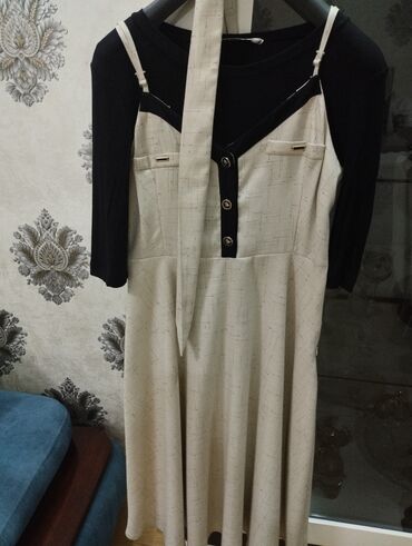 - Tərkib: üst hissə qara, yumşaq trikotaj bluz; üzərində krem rəngli, nazik saplı (spagetti askılı) sarafan tipli paltar