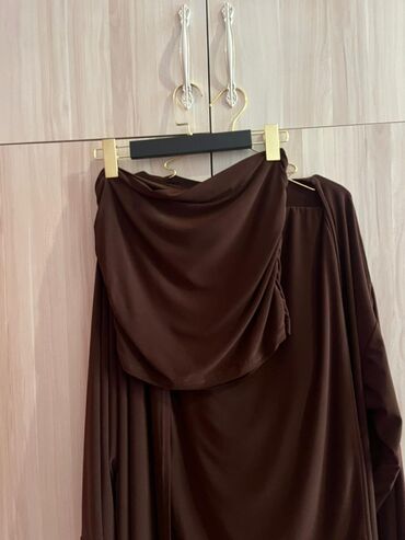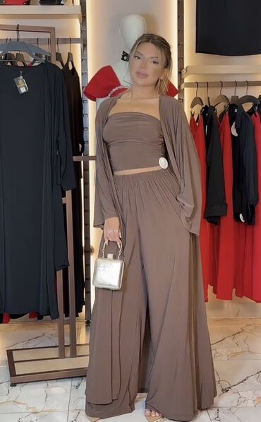 Qadın dəsti – ribli trikotaj, qəhvəyi rəng. Razmer 44 - İki hissə: uzun tunik və şalvar - Parça: incə şaquli ribli, yumşaq və elastik - Tunik: uzunqol, dairəvi yaxa; ön yaxada damcı kəsimi və daş ...