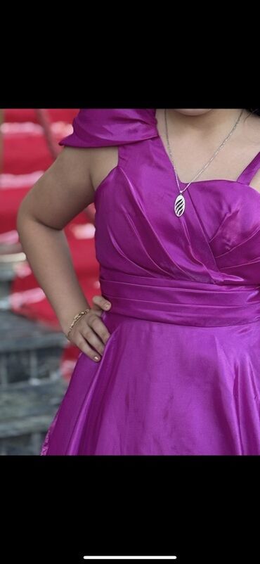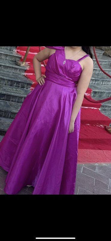 Bənövşəyi/füşya rəngdə, parlaq atlas fakturalı uzun ziyafət donu.