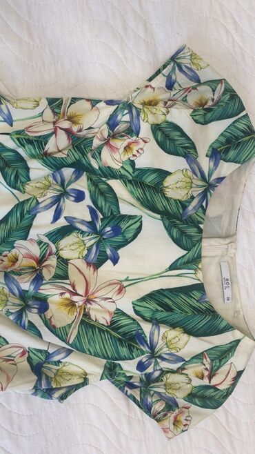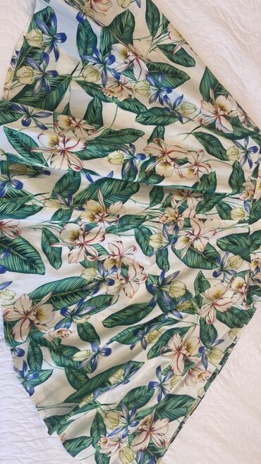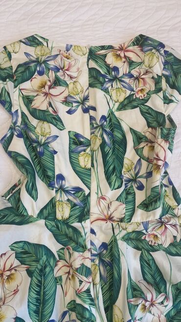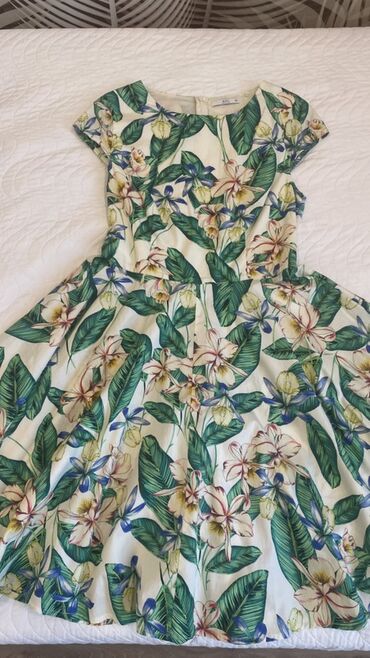 Qadın paltarı – çiçəkli dizayn - Rəng: tünd fon üzərində parlaq çəhrayı, ağ və yaşıl çiçək naxışları - Model: yuxarı hissəsi bədənə oturan, beldən pliseli, ətəyi geniş açılan (A-line/klokat) kəsim...