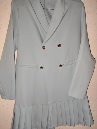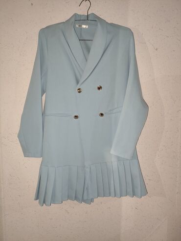 Açıq mavi rəngdə qadın paltarı – bleizer-kəsimli, plisse ətək detallı model.