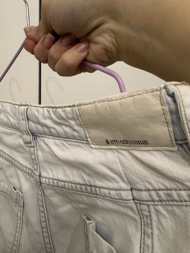 Açıq mavi rəngdə, geniş kəsimli cins şalvar, hər tərəfində böyük cibləri var. 90 manata alınıb 2 defe geyinilib cəmi, real şəkillər var. endirim olunar