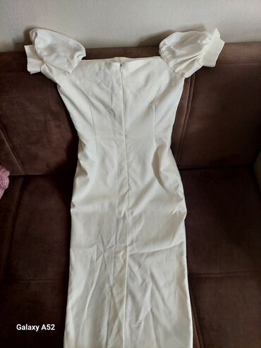Ağ rəngli zərif ziyafət/libas - Brend: Endama (etiketdə göstərilir) - Dizayn: Kvadrat yaxalı, qısa qolf-ətli buf qol. Bədənin ön hissəsindən aşağıya doğru uzanan gümüşü kristal/qayış taşları ilə a...