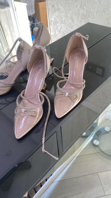 Şəffaf hissələri olan bej rəngli, dabanlı ayaqqabılar. Ayaqqabıların üzərində bant şəklində bəzək elementi var. Ziyafət və xüsusi günlər üçün uyğundur.