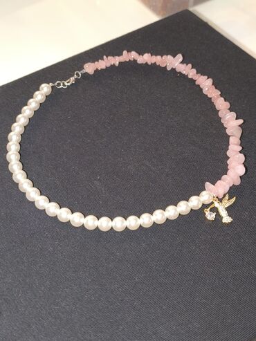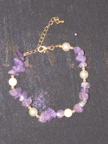 - Bilərzik 1: Açıq bənövşəyi tonlarda təbii daş qırıntıları (ametist üslubunda) və iri ağ mirvari efektli muncuqlarla yığma. Qızılı tonlu ara fiqurlar və karabin qapanma, uzunluğu tənzimlənən zəncir uzatma ilə.