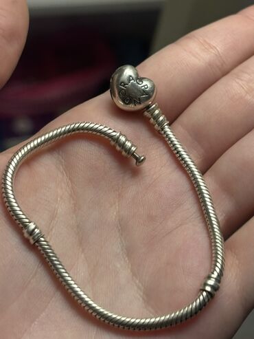 Pandora üslublu gümüş rəngli charm bilərzik - Material: gümüş rəngli metal alaşım (ilan zəncirli tekstura) - Kilid: ürək formasında klips; üzərində “PANDORA” yazısı - Forma: sərt elastik “snake ch...