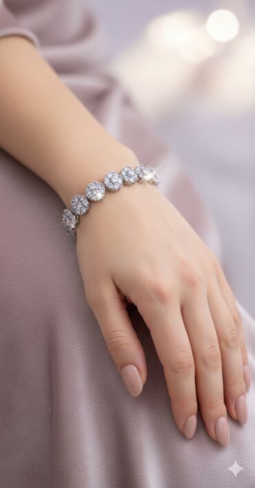 Zərif qadın bilərziyi - Rəng: gümüşü ton - Material: metal ərintisi, parlaq bəzək daşları ilə - Dizayn: mərkəzdə güllə/yarpaq motivli iri naxış, ətrafında xırda daşlarla işləmə; zəncir hissəsi yar...