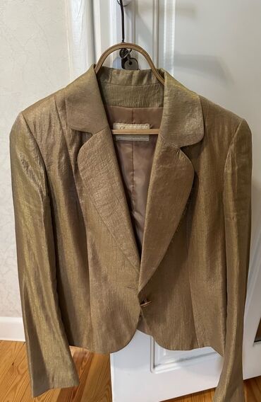 Qadınlar üçün şik zümrüd-yaşıl blazer - Model: iki cərgə düyməli, düz kəsim - Ölçü: 42 (etiket üzərində göstərilib) - Detallar: çiyinlərdə və ciblərin altında sallanan metal/zəncir tipli bəzəklər;...