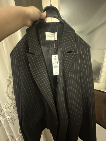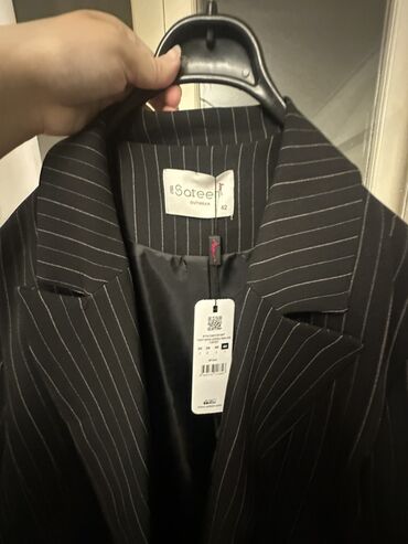 Yenidi etiketi uzerindedir Qara-ağ zolaqlı, ikicərgəli düyməli qadın blezeri - Rəng: qara fon üzərində incə ağ şaquli zolaqlar - Kəsim: klassik, çiyinli, ikicərgəli (double-breasted) - Yaxa: klass...