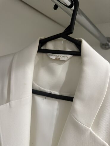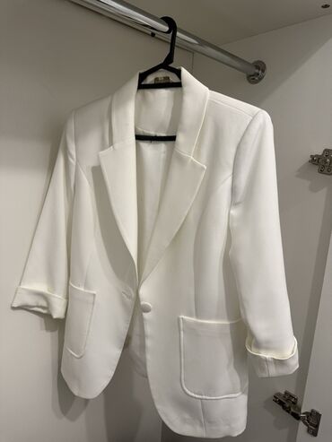 Ağ qadın blazer jaket - Ölçü : XL - Klassik qatlana bilən yaxalıq, 3 düyməli bağlanma - Parlaq dekorativ düymələr (ön hissədə və manjetlərdə) - İki ədəd qapaqlı ön cib, sinədə saxta cib xətti - Düz...