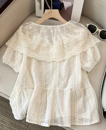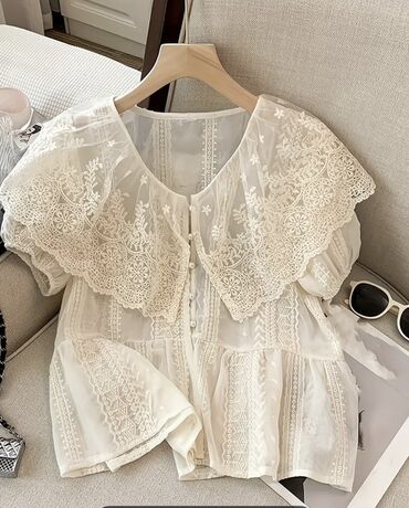 AğYeni kimi , cemi 1 defe geyindim, cox qesengdi, 13 azn/ Naxışlı krujeva yaxalı, qısa qollu qadın bluzu.