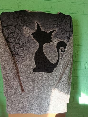 - Model 4: Yumşaq trikotaj fakturalı, boz tonlarda bluz. Arxa/ön paneldə qara pişik silueti və ağac budaqları motivi, uzun qol, rahat günlük kəsim.