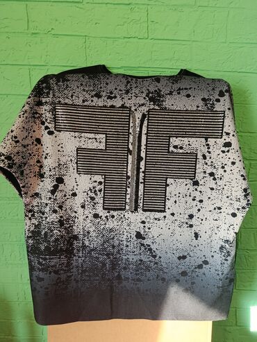 - Model 2: Eyni dizaynın geniş kəsimli variantı. Çiyinlərdən aşağı düşən forma, iri “FF” qrafik elementi, bozdan qara keçidli fon, hər iki tərəfdə ləkəli print.