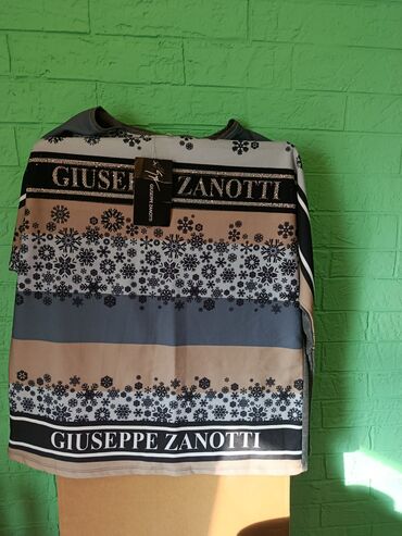 - Model 3: “GIUSEPPE ZANOTTI” yazılı dekorativ lent və qar dənəciyi naxışı olan trikotaj bluz. Boz, bej və qara zolaqlar, dairəvi yaxa, asılmış etiket.