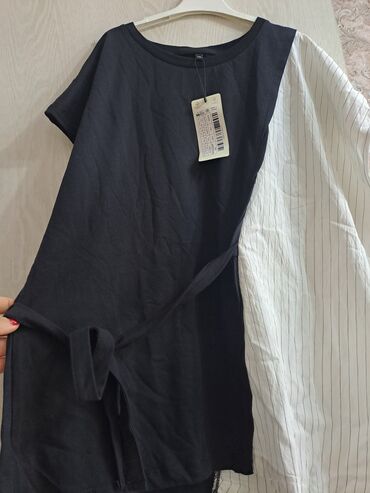 - Rəng və dizayn: Asimmetrik iki rəngli model – bir tərəf tam qara trikotaj, digər tərəf ağ incə şaquli zolaqlı parça. Ön və arxa hissədə formanı vurğulayan, yanlardan bağlanan qara kəmər/qurdeyə lent var.