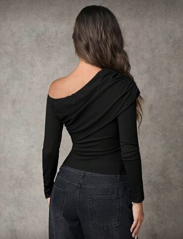 Qara qadın bluzası – drapeli dizayn - Rəng: Dərin qara - Üslub: Asimmetrik kəsim, ön hissədə yumşaq drapeli yaxa - Qol: Qolsuz/çəp çiyin detallı, yüngül büzgülər - Siluet: Bədənə oturan alt hissə,...