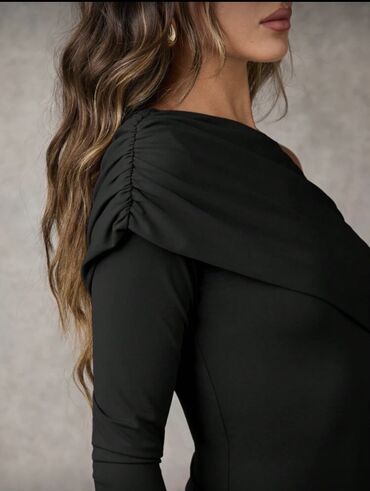 Qara rəngli, çiyinləri açıq triko bluz: - Model: off-shoulder (eni qatlanmış/geniş yoqa büst hissə), uzunqol - Parça: elastik, incə rezinli toxuma (rib-knit), bədəni yüngülcə yığır, formasını saxla...