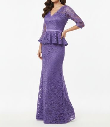 Bənövşəyi rəngdə zərif gecə/libas - Model: Uzun, döşəməboyu, quyruqlu (trainli) siluet - Üst hissə: Dantel parçadan, naxışlı və payetlərlə işıltılı. Çiyin və sinə hissəsində dekorativ krujeva apli...