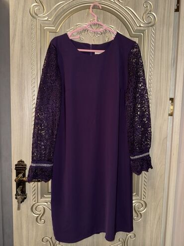 Qadın paltarı – uzunqollu, bədənə oturan kəsim. - Rəng: tünd bənövşəyi. - Material: elastik, yumşaq parça. - Dizayn: sinə və bel hissəsində zərif krujeva zolaqlar; krujevanın üzərində xırda dekorat...