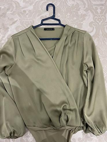 Tünd yaşıl rəngdə qadın bodi bluz - Brend: Trendyol - Model: dərin V dekolteli, uzun qollu, elastik bel tikişli - Materiyal: yumşaq, axıcı və elastik parça (bədənə yatımlı) - Qol forması: yığma çiy...