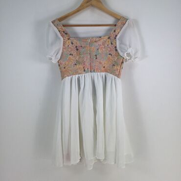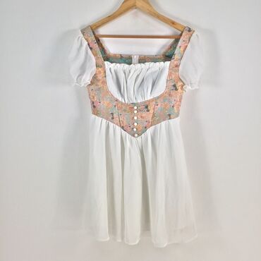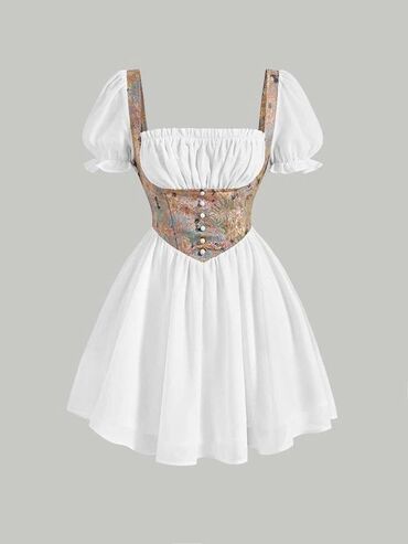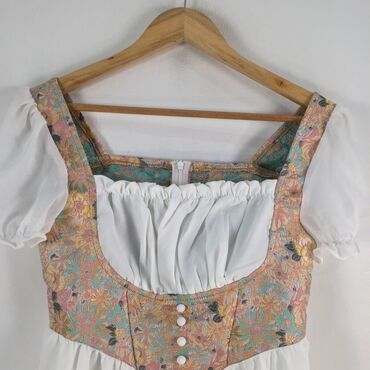 - Rəng: ağ ətək və üst hissə, çiçək naxışlı pastel (şaftalı, mavi, qızılı tonlar) korset hissə