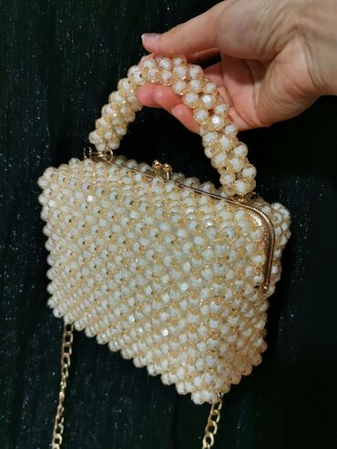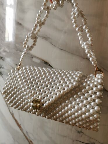 İnci dekorasiyalı mini çanta - Material: Parlaq ağ imitasiya inci muncuqlarla tamamilə əl işi toxunuş. - Dizayn: Üstdən tutacaqlı mini çanta; bədən üçün uzun çıxarıla bilən/çevrilə bilən zəncir-qa...