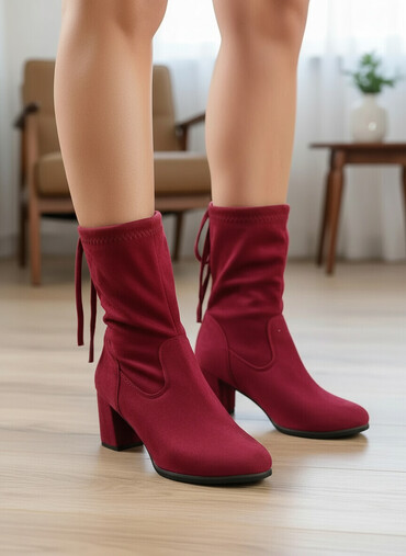 Qadın çəkmələri – bordo rəng - Material: süet (yumuşaq tekstura, mat görünüş) - Rəng: tünd bordo/şərab rəngi - Model: dizaltı, yumşaq şaftlı, arxadan bağlama/bağcığa bənzər lentlərlə yığma - Burun...