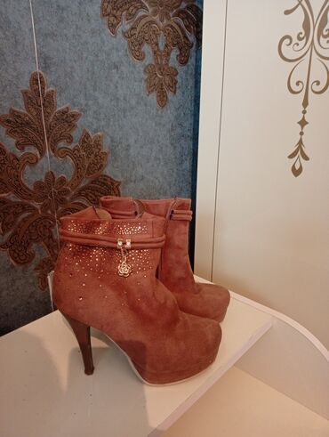 - Süet toxumalı tünd bej botlar – incə hündür daban, platformalı altlıq, rhinestone bəzəklər və asma çarmıx-çiçəkvari aksesuar, yan fermuar