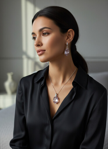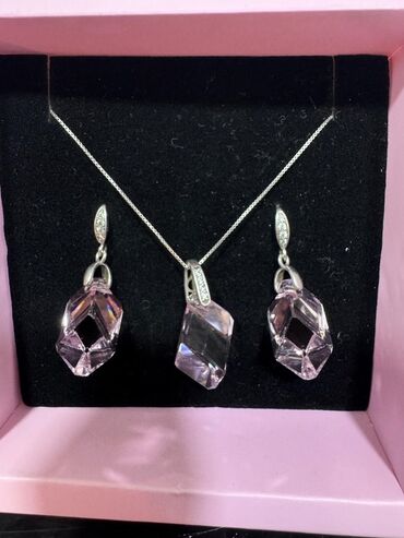Zərif bəzək dəsti – gümüş rəngli metal zəncirli boyunbağı və sırğalar - Dəst: 1 ədəd boyunbağı + 1 cüt sırğa - Sırğalar: armud (göz yaşı) formalı iri şəffaf daşlarla, üst hissədə əlavə kiçik daşlı...