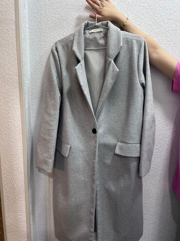 Zərif qadın palto, 500manata alınıb - Rəng: açıq boz/bej tonlarında, xırda teksturalı parça - Model: dizdən aşağı uzunluq, ikicərgəli düymə yerləri, yarı açıq/laçın yaxalı dizayn - Yaxa: çıxarıla b...