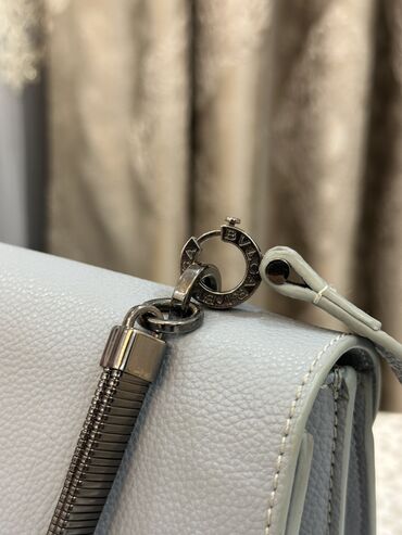 Qara rəngli zərif çiyin çantası Bulgari original - Parlaq fakturalı dəri görünüşlü material - Qapaqlı dizayn, ilan başı formalı metal kilid (yaşıl detallı) - Gümüşü rəngdə ikili zəncir qayış: çiyin...