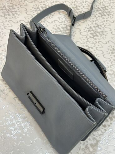 Qadınlar üçün şık çiyin çantası - Rəng: boz - Material: hamar teksturalı süni dəri - Forması: sərt quruluşlu, qapaqlı model - Dizayn: ön qapaqda kəsikli dekorativ elementlər və metal halqalı kilid...