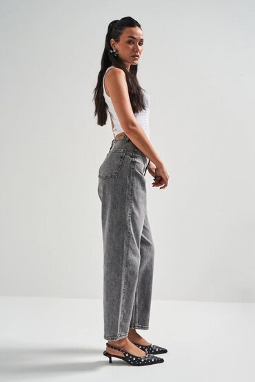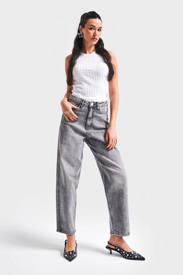 - Kəsim: yüksək bel, düz və geniş siluet (loose/straight fit)
