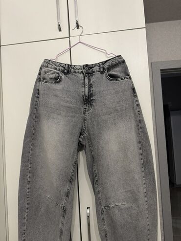Beli yüksək, boş (wide-leg) model cins şalvar. - Ölçü: XL - Parça: qalın denim, yüngül yuyulma effekti - Rəng: tünd boz-yaşıl tonlarda vintaj yuyulma - Kəsim: geniş balaq, düz xətt; yüksək bel form...