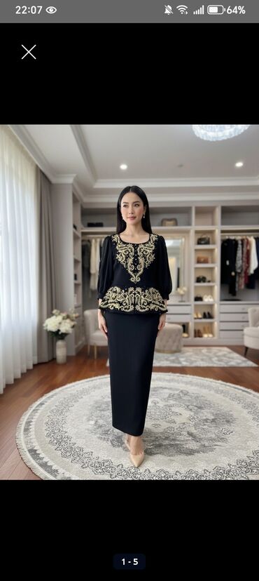 Qara fon üzərində ağ çiçək naxışlı iki hissədən ibarət qadın dəsti. Dəst uzun ətək və uyğunlaşan bluzdan ibarətdir. - Ətək: A-çəkmə siluet, qələm-ətəkdən daha rahat kəsim; yanda yarıqla hərəkət ra...