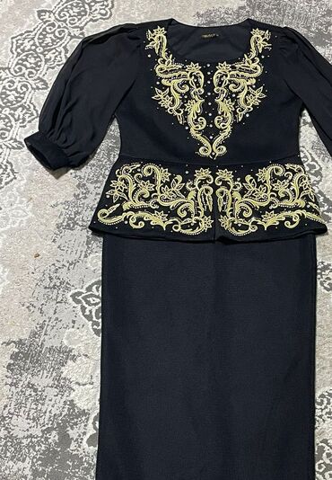 Bir defe geyinilib…..Qadın dəsti – qara üst və ətək kombini - Üst: qısaqol, krujeva-sığ V yaxalı, jaket üslublu kəsim. Qara rəng, yüngül və rahat parçadan. - Ətək: ön yanlarda dərin kəsikli qara ö...