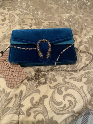 2) Mavi məxmər və mavi dəri kombinasiyalı çanta (Gucci loqolu etiket və daxili damğa görünür)