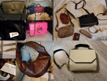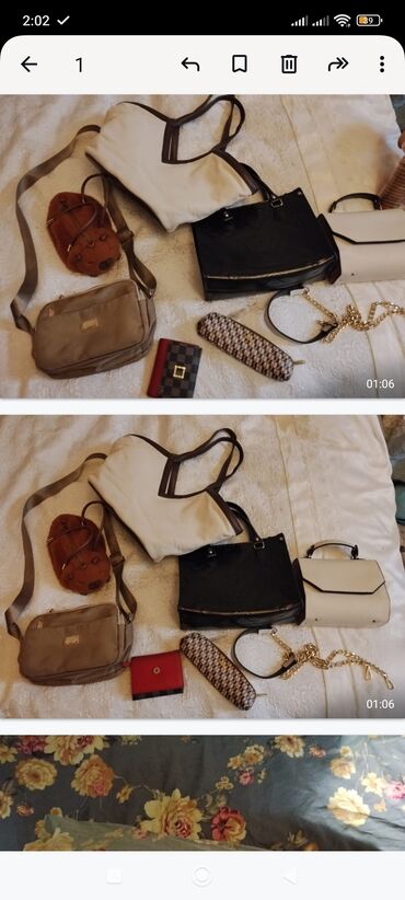 Müxtəlif üslub və ölçülərdə qadın çantaları və kiçik aksesuarların qarışıq dəsti. Şəkillərdə görünən nümunələr: