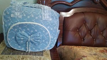 - Bəzək: Ön tərəfdə böyük parça kəpənək və inci bəzəkləri; üst hissədə enli ağ krujeva detallı iki ədəd tutacaq