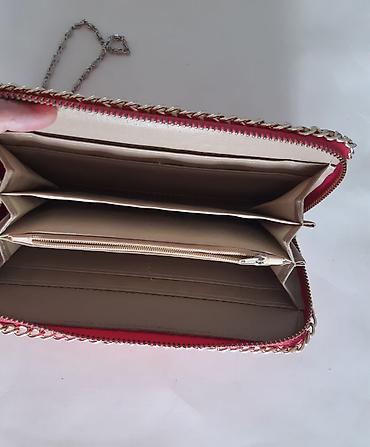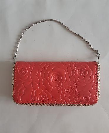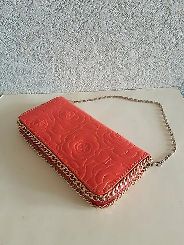 Qırmızı rəngli, üzərində gül naxışları olan zərif qadın portmanesi. Çanta ( klatç) kimi də istifadə etmək olar. Portmane qızılı rəngli zəncir detalları ilə bəzədilib və zərif görünüşə malikdir. İçərisində kartlar və digər əşyalar üçün bölmələr mövcuddur. Ziyafətlər və xüsusi günlər üçün ideal seçimdir. Qulpunu çıxartmaq da olar.