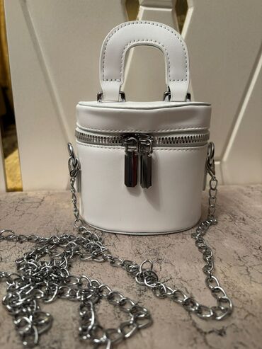 - Ağ silindrik mini çanta: Silindr forması, hamar ağ material, üst hissədə ikili fermuar. Kiçik tutacaq, metal zəncirli çiyin qayışı. Kompakt ölçüdə, kart və açar üçün rahat. Metal detalları gümüş tonludur.