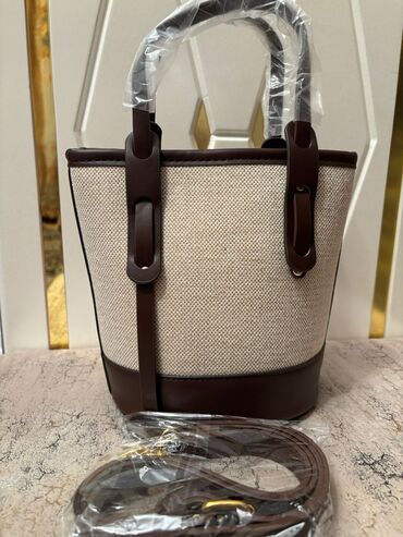 - Bej bucket tipli çanta: Toxuma bej parça gövdə, tünd qəhvəyi dəri altlıq və haşiyələr. İki ərkən tutacaq, uzun çıxarıla bilən tənzimlənən çiyin qayışı dəstdə. Düz dayanan oval dib, gündəlik istifadə üçün geniş içlik.