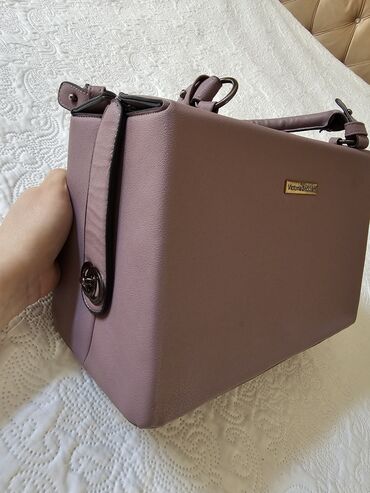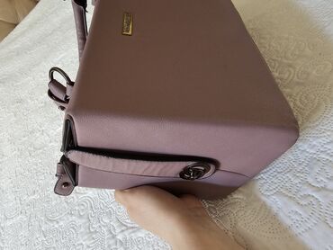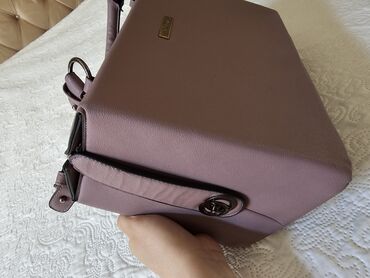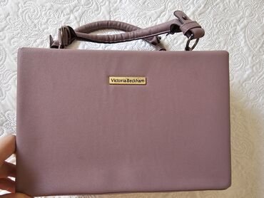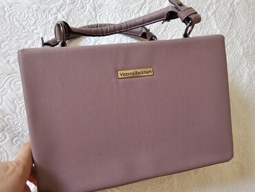 Victoria Beckham qadın çantası – pudra-bənövşəyi rəngdə, sərt formalı struktura və dəri fakturalı səthə malikdir. Üzərində qızılı tonlu “Victoria Beckham” loqotipi.
